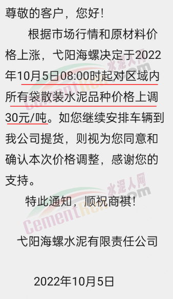 弋陽海螺水泥有限責任公司通知自10月5日8時起對區(qū)域內所有水泥品種價格上調30元/噸。