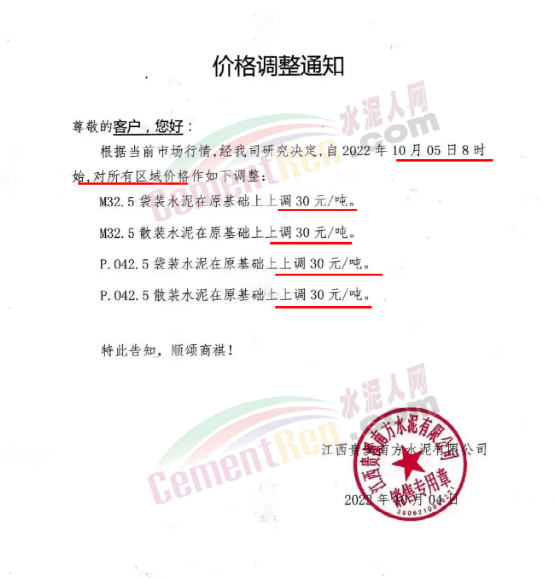 江西贛縣南方水泥有限公司通知,自10月6日8時起各標號水泥上調15-30元/噸。