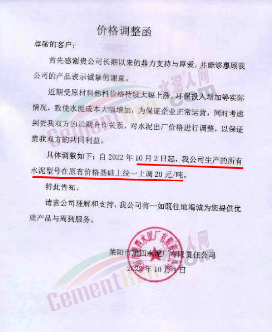 萊陽市第四水泥廠有限責任公司價格調整函稱,近期受原材料熟料價格持續(xù)大幅上漲,環(huán)保投入增加等實際情況,致使水泥成本大幅增加,為保證企業(yè)正常運營,自10月2日起對水泥出廠價格統(tǒng)一上調20元/噸。