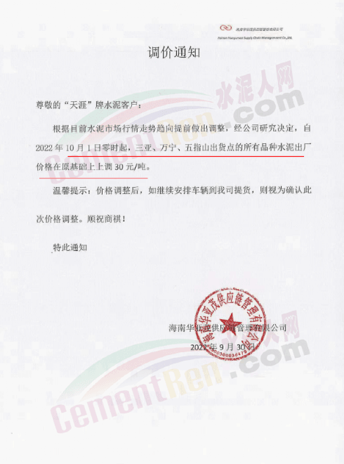 海南華亞茂供應鏈管理有限公司通知10月1日零時起,三亞、萬寧、五指山出貨點的所有品種水泥出廠價在原基礎上上調30元/噸。