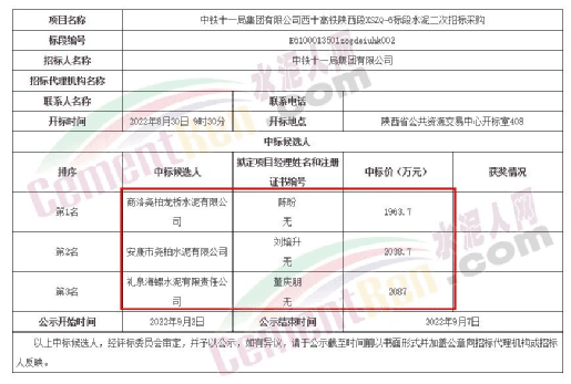 9月初,陜西區(qū)域,中鐵十一局某項目水泥招標(biāo),中標(biāo)候選人包括兩家堯柏水泥和一家海螺水泥。從排序來看,海螺水泥位于第3名,中標(biāo)價與兩家堯柏水泥相差123.3萬元和48.3萬元,而這第3名等同于沒有中標(biāo)。