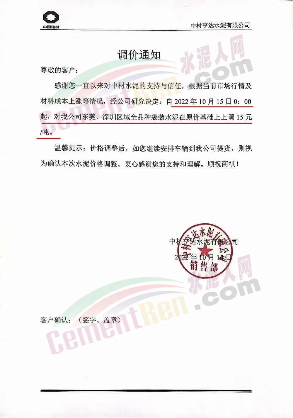 中材亨達(dá)水泥通知10月15日0時(shí)起,對東莞、深圳區(qū)域全品種袋裝水泥上調(diào)15元/噸。