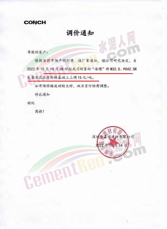 深圳市嘉順建材有限公司通知10月15日8時(shí)起公司銷售的“海螺”牌M32.5、P.O42.5R包裝水泥在原價(jià)基礎(chǔ)上上調(diào)15元/噸。