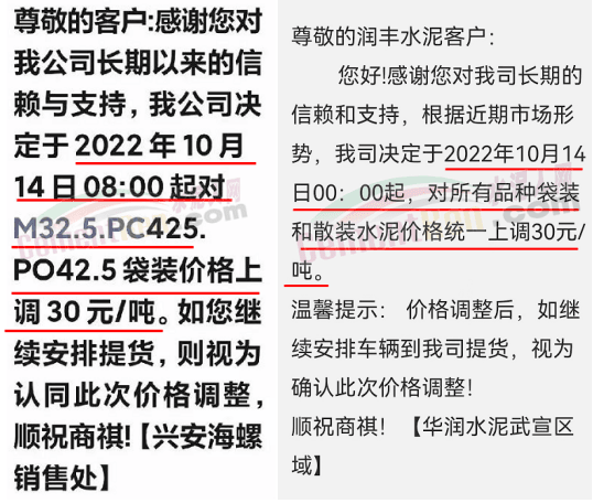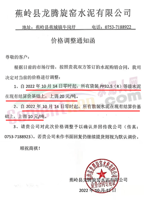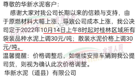 華新水泥(道縣)有限公司通知,由于原燃材料大幅上漲,導(dǎo)致公司成本上漲,公司定于2022年10月14日上午8時(shí)起對桂林區(qū)域所有袋裝品種水泥上調(diào)30元/噸;散裝水泥價(jià)格上調(diào)30 元/噸。