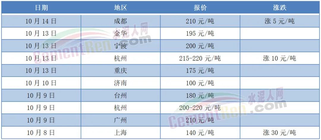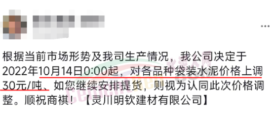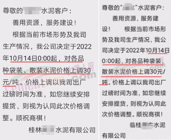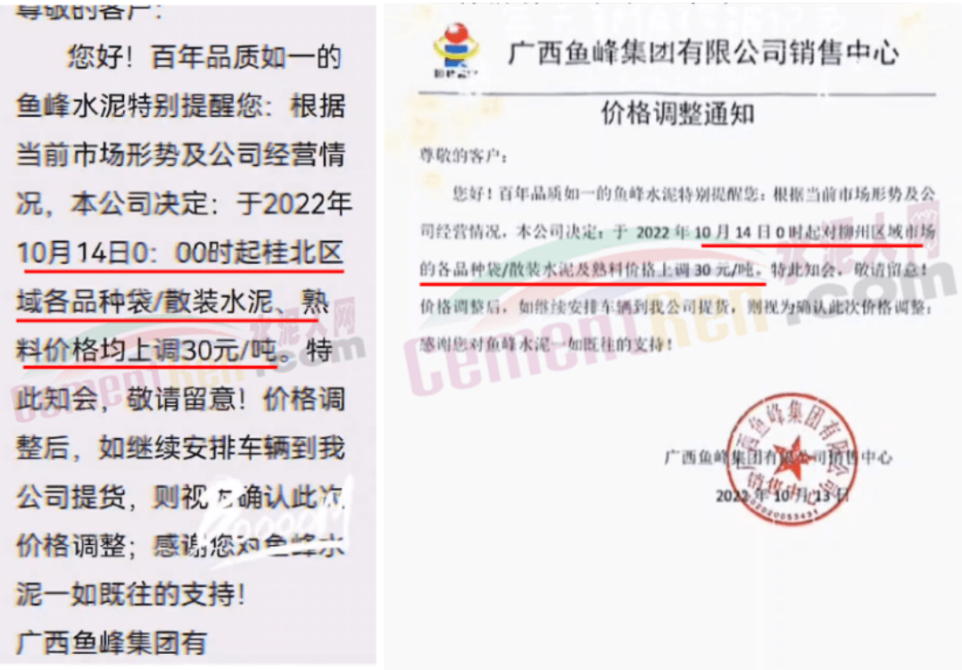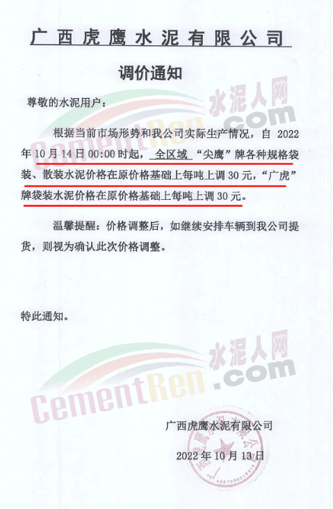 廣西區(qū)域包括海螺、華潤、華新、魚峰、虎鷹水泥在內(nèi)的多家品牌水泥通知于10月14日起,對各品種袋裝、散裝水泥價(jià)格上調(diào)30元/噸。