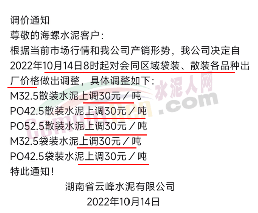 海螺水泥旗下云峰水泥通知,10月14日8時(shí)起,各標(biāo)號水泥上調(diào)30元/噸。
