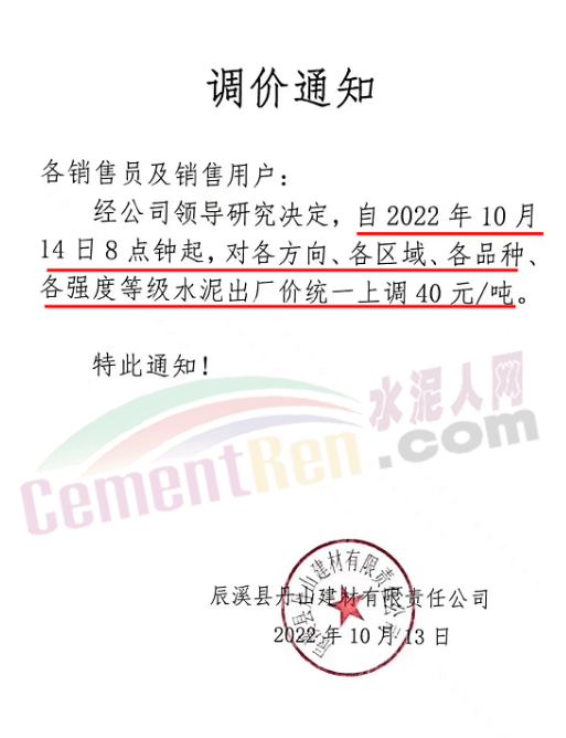 湖南懷化辰溪丹山建材有限公司通知 10月14日8時(shí)起,對各方向、各區(qū)域、各品種、各強(qiáng)度等級水泥出廠價(jià)上調(diào)40元/噸。