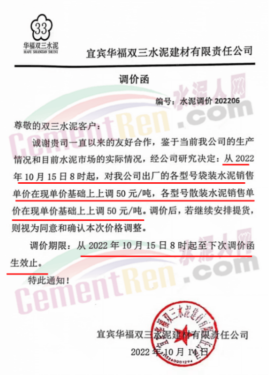 四川賓華福三雙水泥建材有限公司通知,從10月15日8時(shí)起,各標(biāo)號水泥報(bào)價(jià)上調(diào)50元/噸。