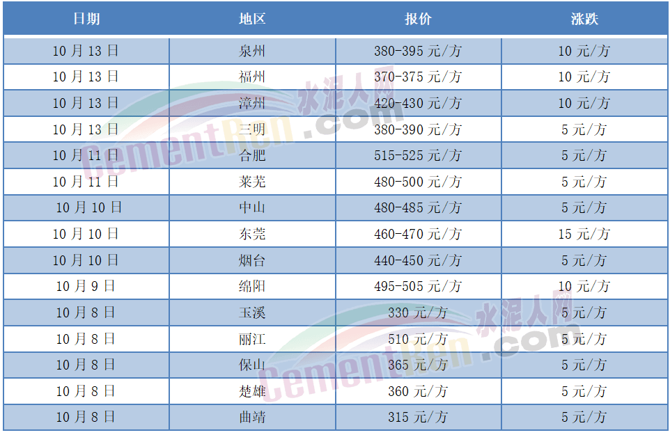 華潤水泥投資有限公司通知10月14日0時(shí)起,公司中山、珠海、江門各銷售區(qū)域散裝水泥價(jià)格上調(diào)10元噸。15日0時(shí)起,公司東莞、深圳各銷售區(qū)域全品種袋裝水泥上調(diào)15元/噸。