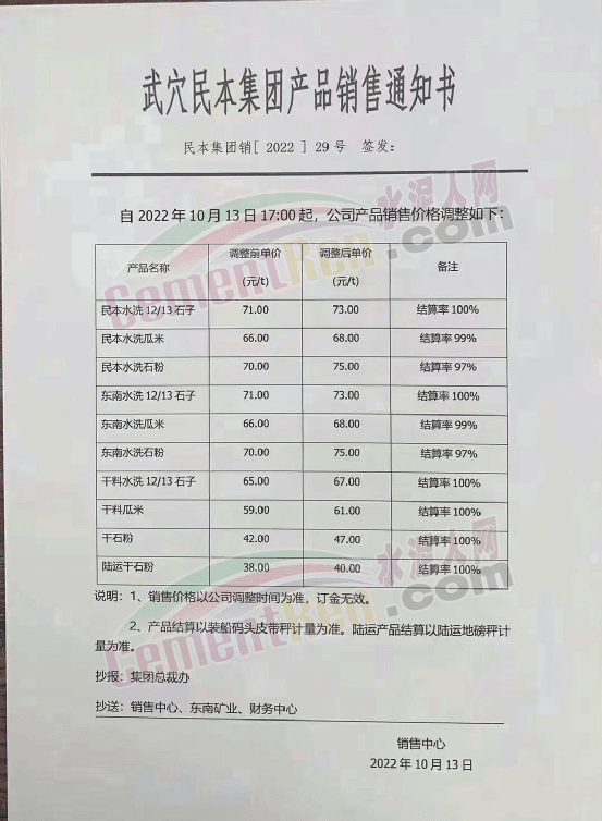 同期,武穴民本集團(tuán)通知自2022年10月13日17∶00起,調(diào)整旗下產(chǎn)品報(bào)價(jià),調(diào)整后價(jià)格較之前高出2-5元/噸。
