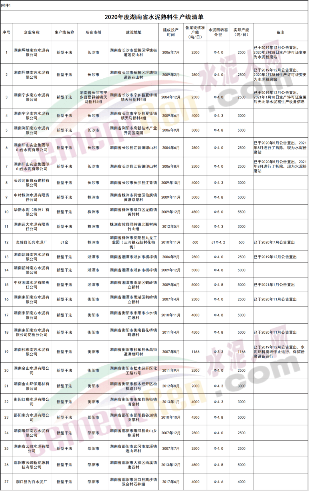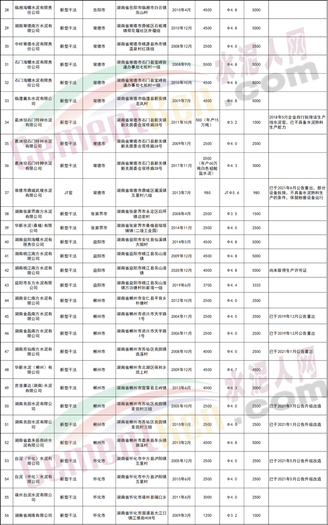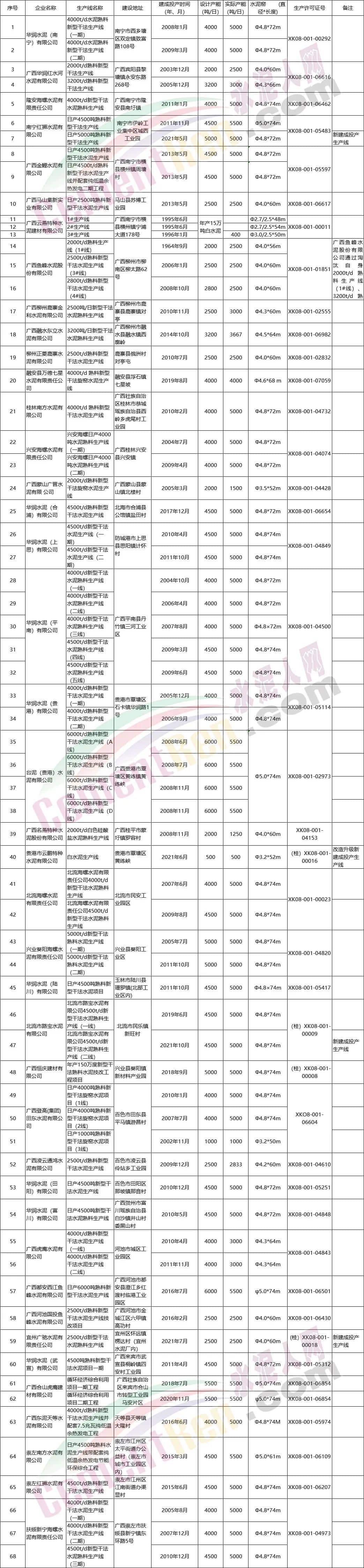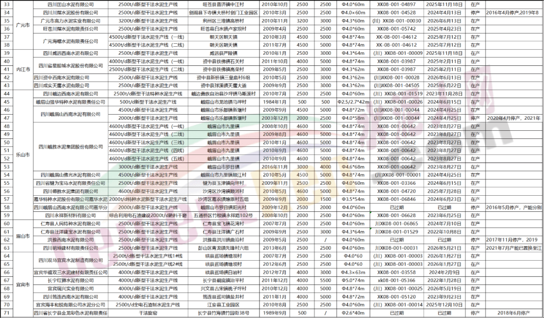2021年度四川省熟料水泥生產(chǎn)線清單