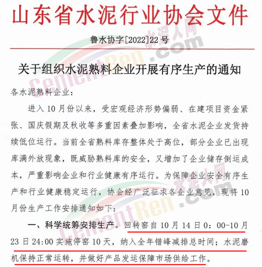 日前,山東水泥熟料企業(yè)收到通知,要求所有水泥熟料生產(chǎn)線企業(yè)自10月14日0時起至10月23日24時實(shí)施停窯10天,納入全年錯峰減排總時間。