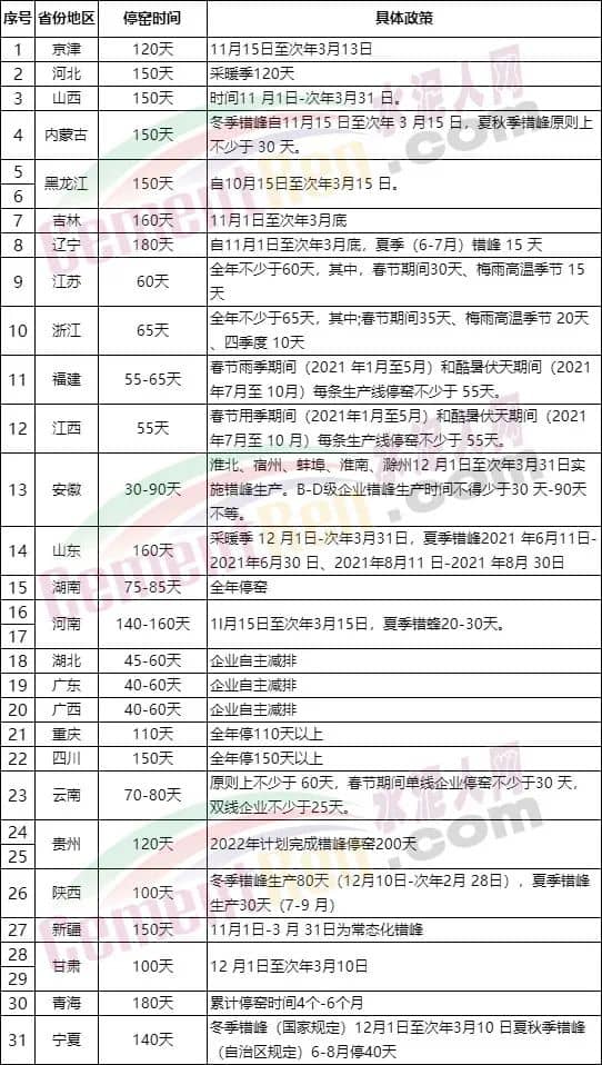 按照各區(qū)域常態(tài)化錯峰生產(chǎn)的要求京津冀、山西、內(nèi)蒙古、遼寧、吉林、黑龍江、山東、河南、重慶、四川、貴州、新疆、寧夏、青海、陜西、甘肅等近二十個省市地區(qū)全年停窯時間都超過了100天,在冬季采暖季有近千條熟料生產(chǎn)線集體停產(chǎn)。