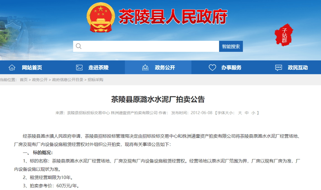 茶陵縣原潞水水泥廠:經(jīng)茶陵縣潞水鎮(zhèn)人民政府申請,茶陵縣招標投標管理局決定由招標投標交易中心和株洲遞壹資產(chǎn)拍賣有限公司將茶陵縣原潞水水泥廠經(jīng)營場地、廠房及現(xiàn)有廠內(nèi)設備設施租賃經(jīng)營權對外組織公開拍賣。拍賣標的為茶陵縣原潞水水泥廠經(jīng)營場地、廠房及現(xiàn)有廠內(nèi)設備設施租賃經(jīng)營權。經(jīng)營場地以原水泥廠范圍為界,廠房以現(xiàn)有廠房為準,廠內(nèi)設備設施以現(xiàn)狀為準。租賃經(jīng)營期限為10年。拍賣參考價:60萬元/年。