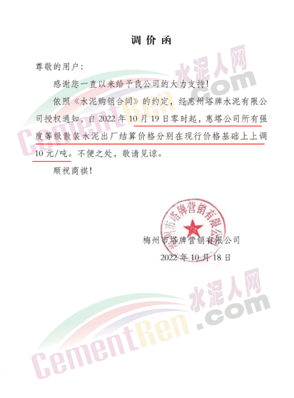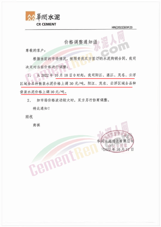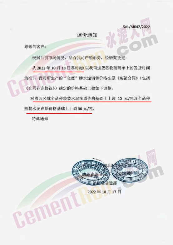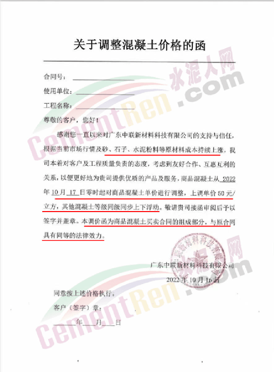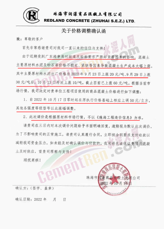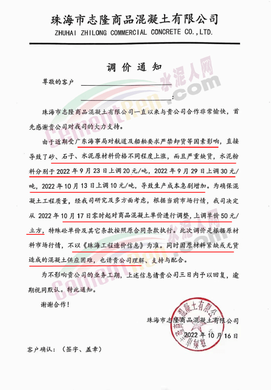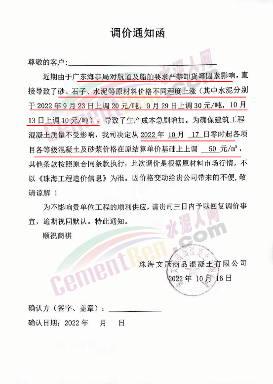 珠海三潤混凝土有限公司、珠海文冠商品混凝土有限公司、珠海市志隆商品混凝土有限公司、珠海市潤濠商品混凝土有限公司、廣東中聯(lián)新材料科技有限公司、珠海市錦龍混凝土有限公司、珠海凌宇混凝土有限公司等近十家混凝土企業(yè)通知稱,由于廣東海事局對航道及船舶要求嚴(yán)禁卸貨等因素影響,直接導(dǎo)致了砂、石子、水泥等原材料價格不同程度上漲。其中水泥分別于2022年9月23日上調(diào)20元/噸,9月29日上調(diào)30元/噸,10月13日上調(diào)10元/噸,累計上調(diào)60元/噸,導(dǎo)致了混凝土生產(chǎn)成本急劇增加。為確保建筑工程混凝土質(zhì)量不受影響,混凝土公司決定各項目各等級混凝土及砂漿價格在原結(jié)算單價基礎(chǔ)上上調(diào)50元/m³。且強(qiáng)調(diào)此次調(diào)價是根據(jù)原材料市場行情,不以《珠海工程造價信息》為準(zhǔn)。同時提到,因原材料緊缺或無貨造成的混凝土供應(yīng)困難,也請客戶理解、支持與配合。