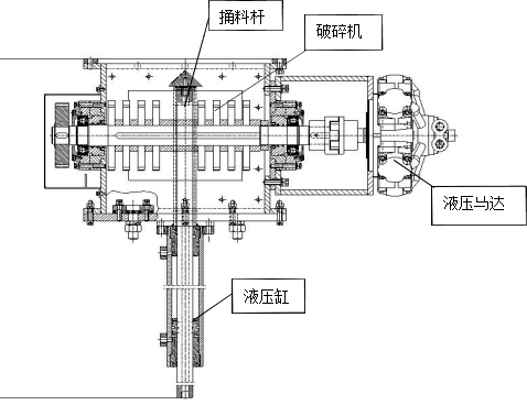 1500~2000mm,負(fù)責(zé)處理平板閘以上結(jié)拱的塊狀料甚至大塊料,中空油缸聯(lián)接羅茨風(fēng)機到減壓錐內(nèi)部可以替代部分充氣箱功能,以解決架空料的處理難題;下部在破碎機構(gòu),將溜下到破碎腔的塊狀料破碎成 2 公分左右的小塊,使得小塊能隨粉料一起被斜槽送走,解決在斜槽卸料器拐彎處堵料問題;由于本身破碎腔中自帶約 2.5 公分間隙,對正常粉料卸料沒有影響。如果發(fā)生破碎腔有堵,反而說明里面有塊狀料,這時只要開啟疏堵機,就能快速疏通。由于現(xiàn)場安裝空間所限和提供較強的破碎能力,該系統(tǒng)采用了液壓馬達(dá),羅茨風(fēng)機,與液壓捅料機構(gòu)合起來集成為一個液壓系統(tǒng)。其設(shè)備示意圖如下: