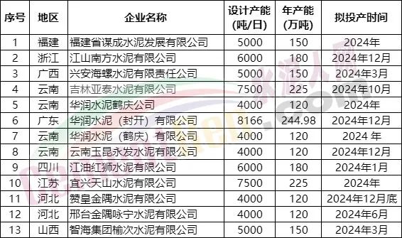 據(jù)水泥人網(wǎng)此前報(bào)道,今年內(nèi)已點(diǎn)火投產(chǎn)的生產(chǎn)線分別為: