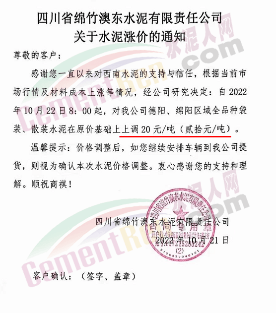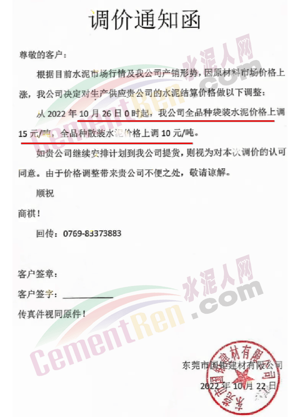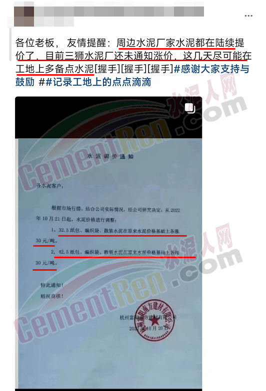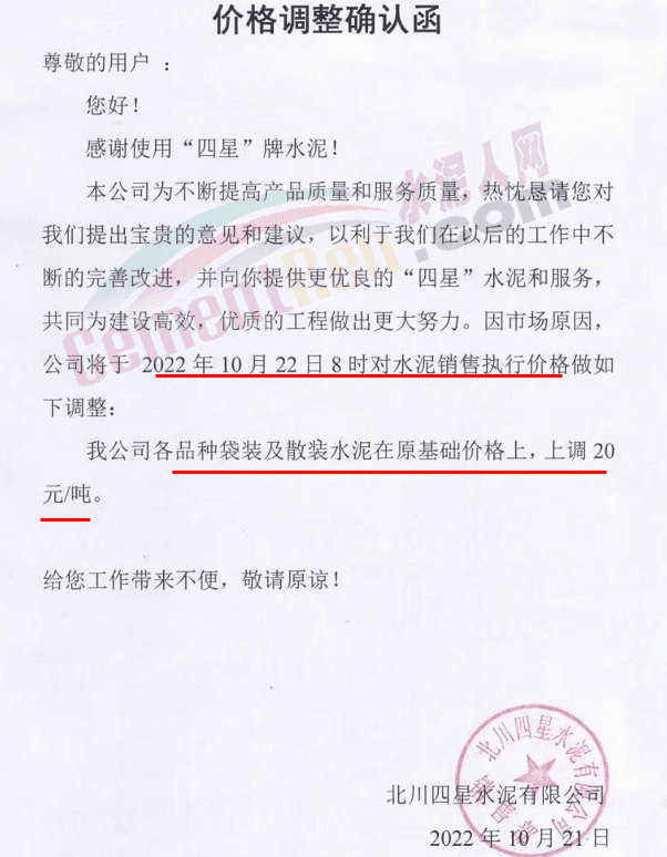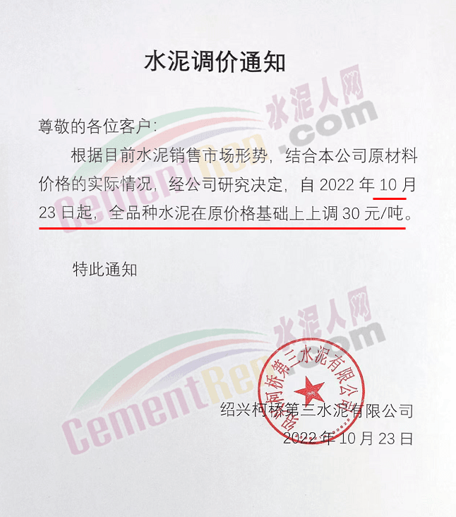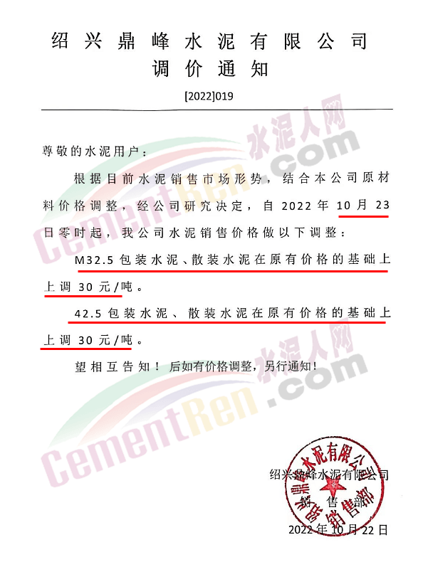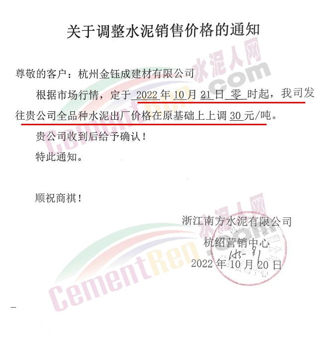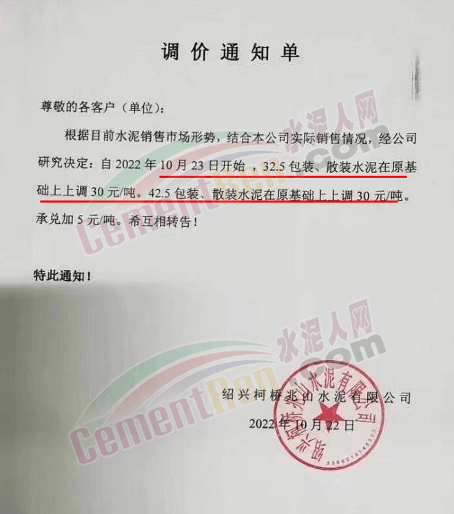 山東蓮山水泥股份有限公司通知,根據(jù)市場(chǎng)行情及各種材料和生產(chǎn)成本上漲等情況,經(jīng)研究決定,從10月24日起對(duì)各品種水泥在原基礎(chǔ)上上調(diào)15元/噸。