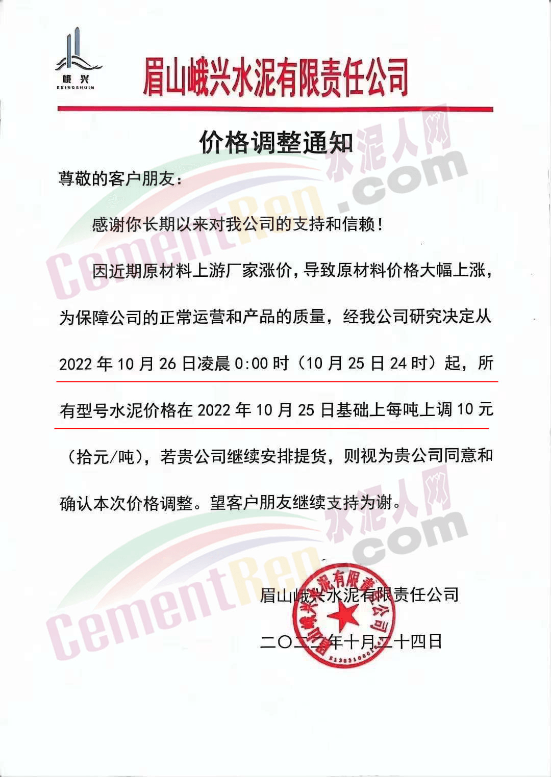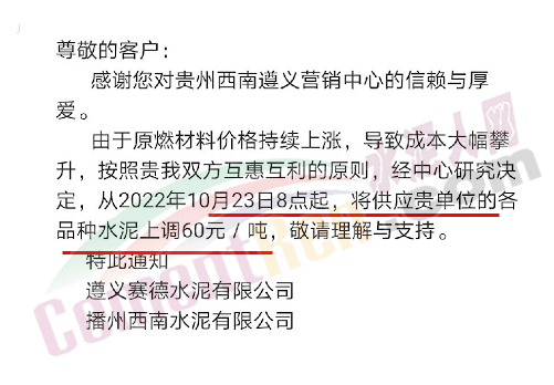 貴州西南遵義營(yíng)銷(xiāo)中心通知,10月23日起各品種水泥價(jià)格上調(diào)60元/噸.