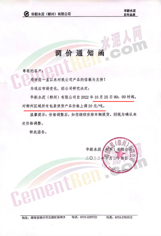 華新水泥(郴州)有限公司通知10月25日起對(duì)郴州區(qū)域所有包裝供貨價(jià)格上調(diào)20元/噸。