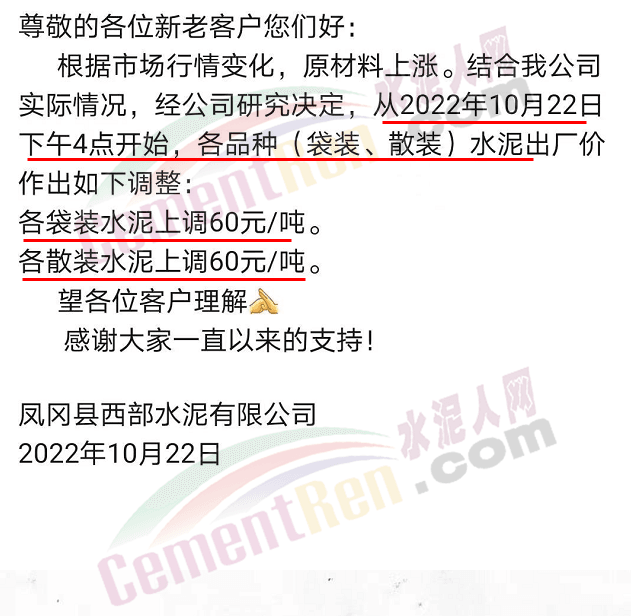 貴州省遵義市鳳岡縣西部水泥有限公司通知,22日起各標(biāo)號(hào)水泥上調(diào)60元/噸。