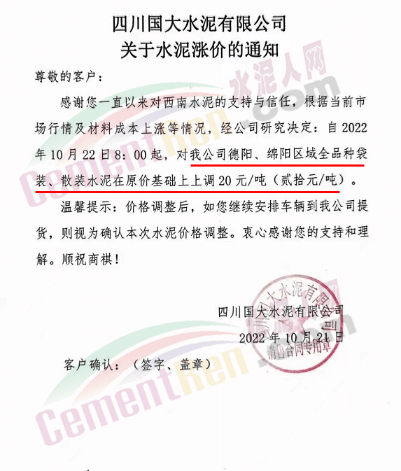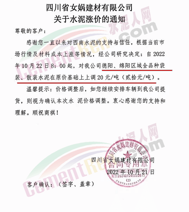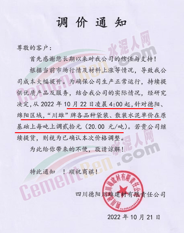云南省大理白族自治州南澗縣金球建材有限責(zé)任公司通知,受原材料價(jià)格上漲,電力供應(yīng)受限,導(dǎo)致公司水泥生產(chǎn)成本上漲。自10月23日0時(shí)起上調(diào)50元/噸。