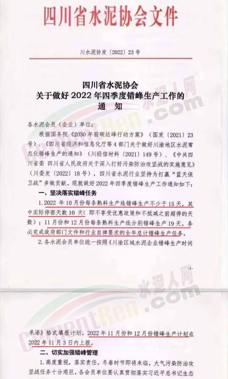 日前,四川省水泥協(xié)會發(fā)布《關(guān)于做好2022年四季度錯峰生產(chǎn)工作的通知》提到10月份每條熟料生產(chǎn)線錯峰生產(chǎn)不少于15天,其中實際停窯天數(shù)10天。(即不享受優(yōu)惠政策和不抵減之前超停的天數(shù));11月份和12月份每條熟料生產(chǎn)線分別錯峰生產(chǎn)19天。務(wù)必完成政府部門文件和行業(yè)自律要求的全年總計錯峰生產(chǎn)任務(wù)。