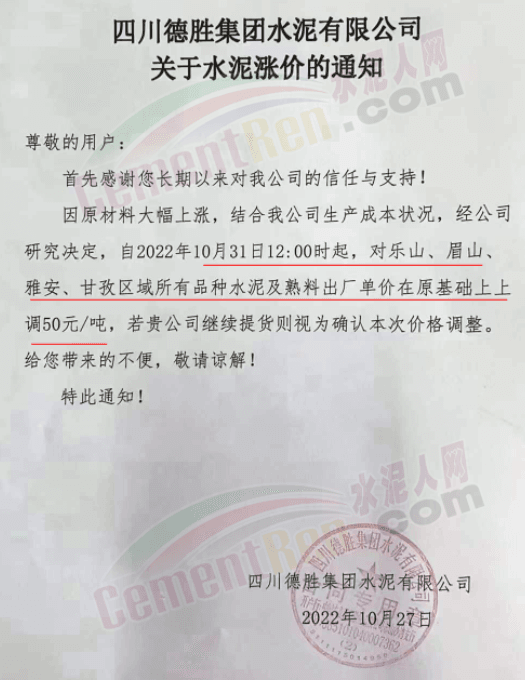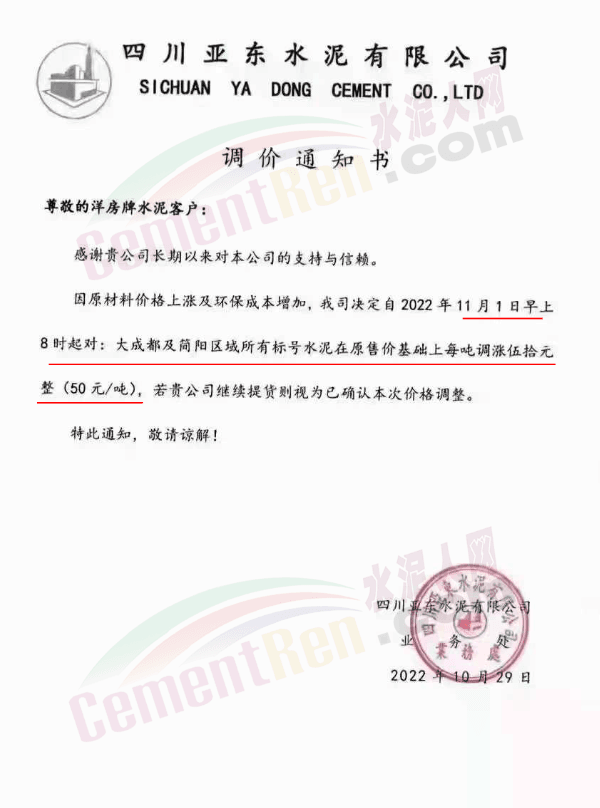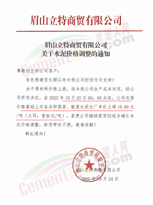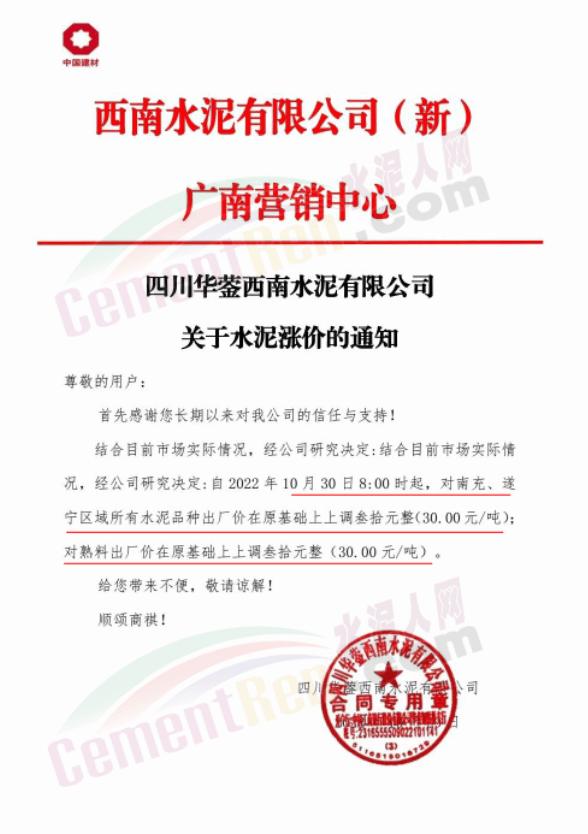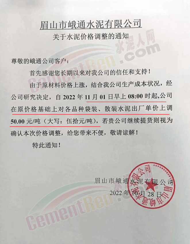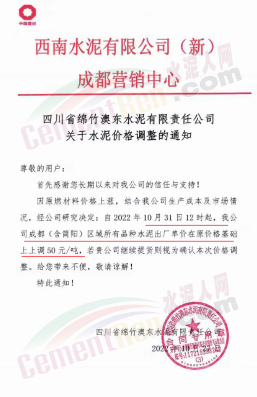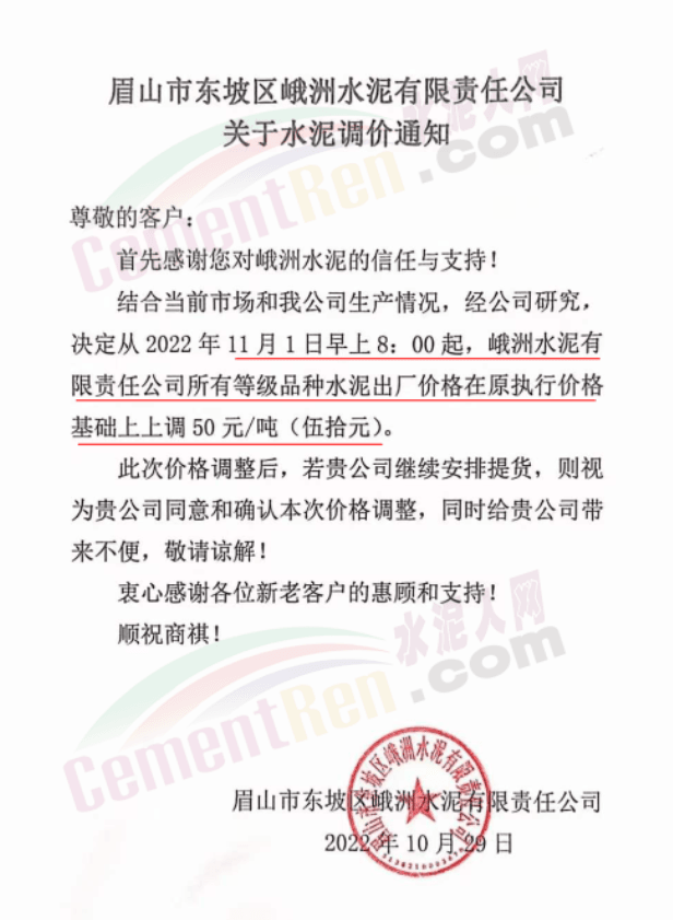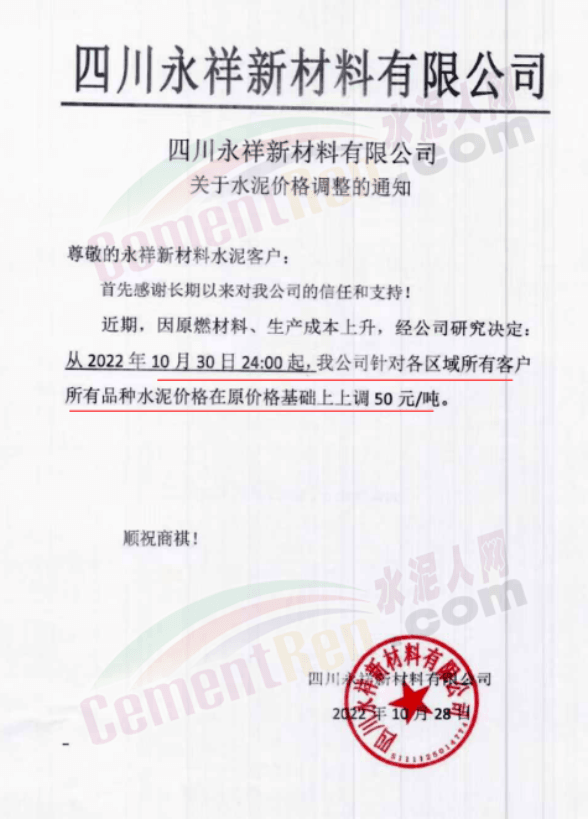 據(jù)了解,本輪調(diào)價是從10月30日起,包括粉磨站在內(nèi)的多家水泥企業(yè)通知上調(diào)水泥價格50元/噸,熟料價格同步上調(diào)30元/噸。