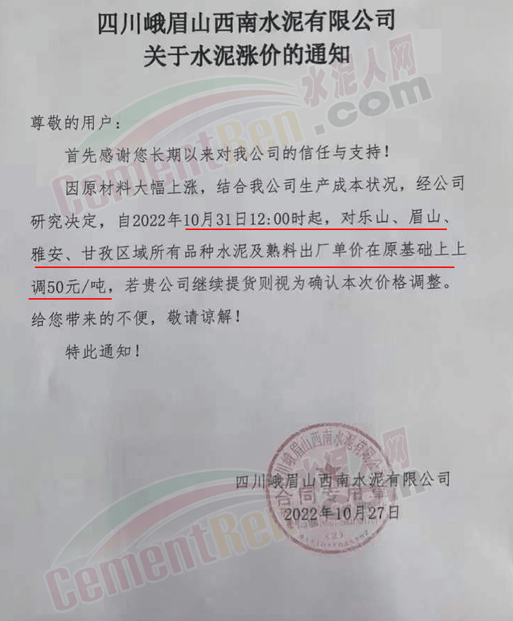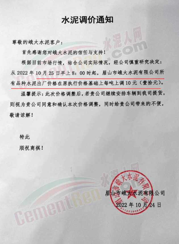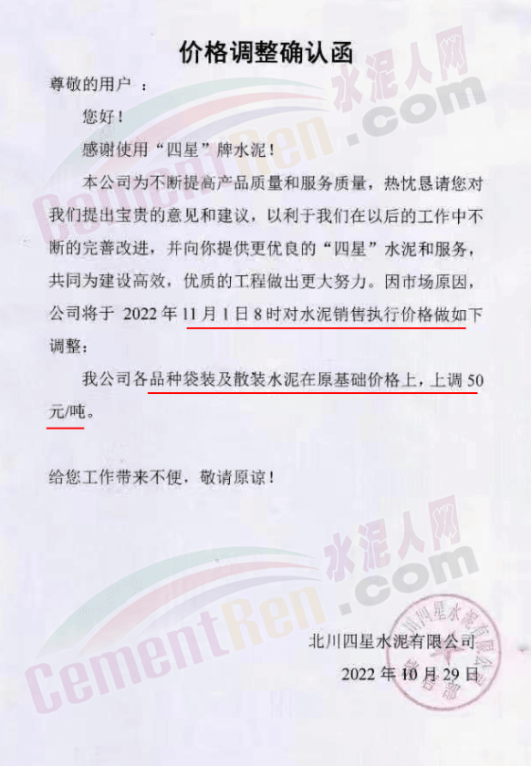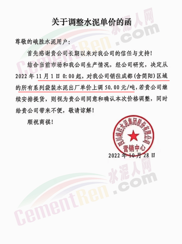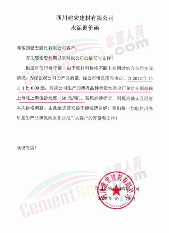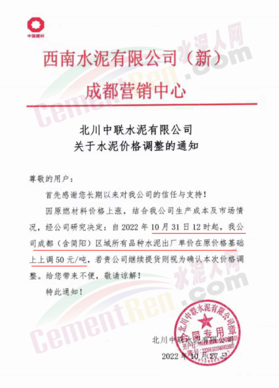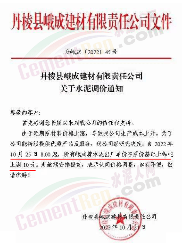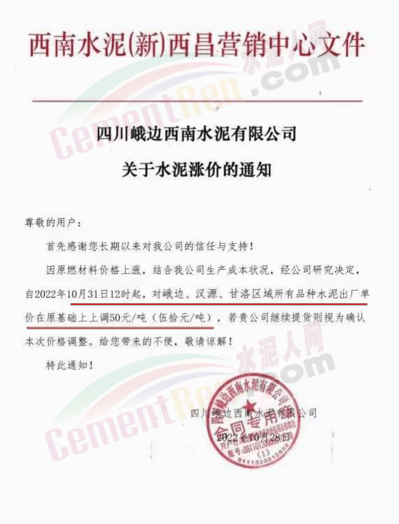 據(jù)了解,本輪調(diào)價是從10月30日起,包括粉磨站在內(nèi)的多家水泥企業(yè)通知上調(diào)水泥價格50元/噸,熟料價格同步上調(diào)30元/噸。