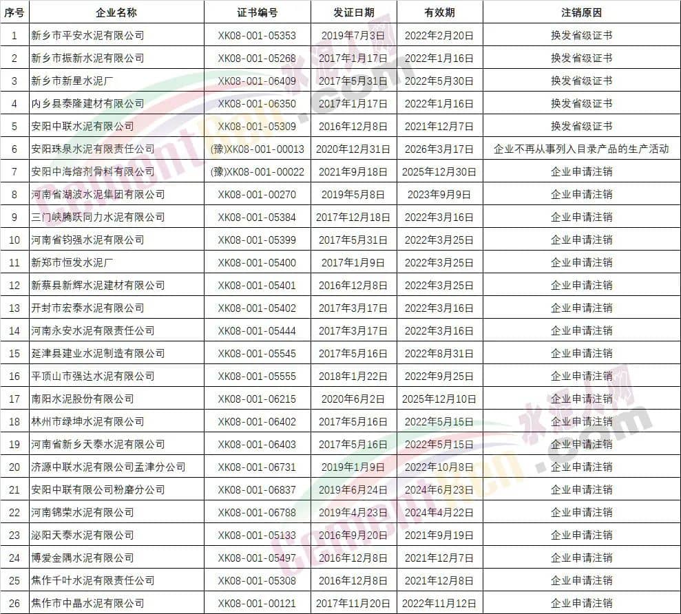湖南省20家企業(yè)生產(chǎn)許可證注銷,16家水泥企業(yè)換發(fā)新編號證書,3家企業(yè)申請注銷,1家企業(yè)實地審查不合格;