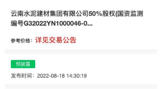 8月18日,云南產(chǎn)權交易所發(fā)布云南水泥建材集團有限公司50%股權轉(zhuǎn)讓預披露公告。