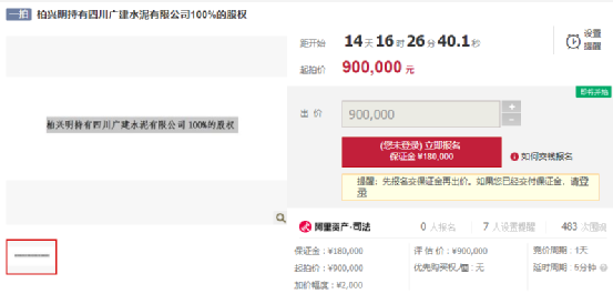 來自阿里資產(chǎn)司法拍賣頻道的消息,近期柏興明持有四川廣建水泥有限公司100%的股權將公開拍賣,起拍價900,000 元。