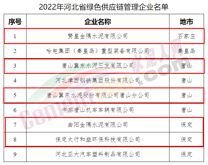2022年河北省綠色供應(yīng)鏈管理企業(yè)名單中包含贊皇金隅水泥有限公司、唐山冀東水泥三友有限公司、唐山冀東水泥股份有限公司唐山分公司、曲陽(yáng)金隅水泥有限公司、保定太行和益環(huán)??萍加邢薰镜?家水泥企業(yè)。