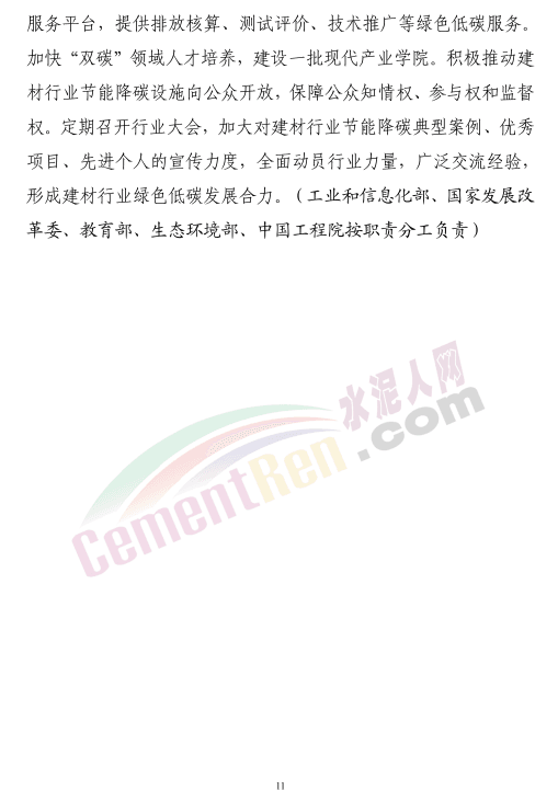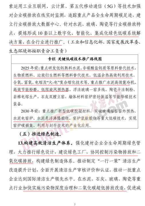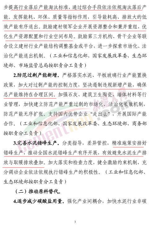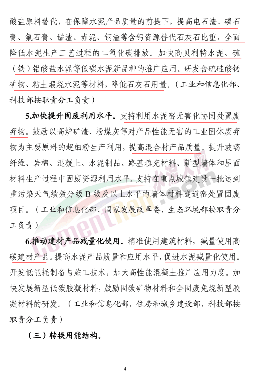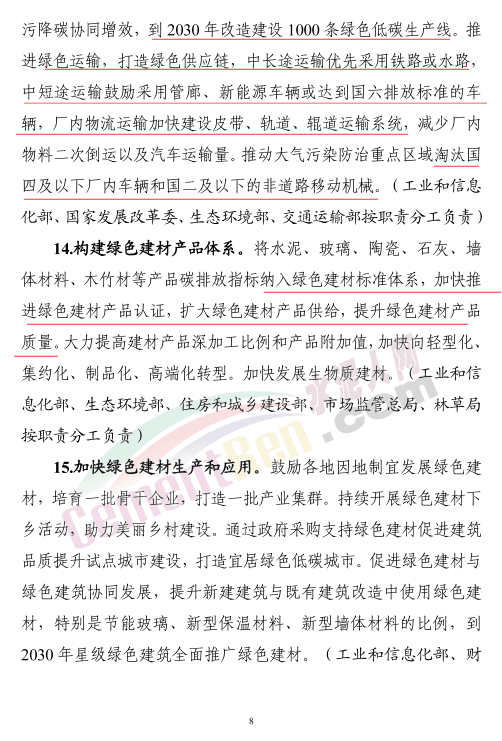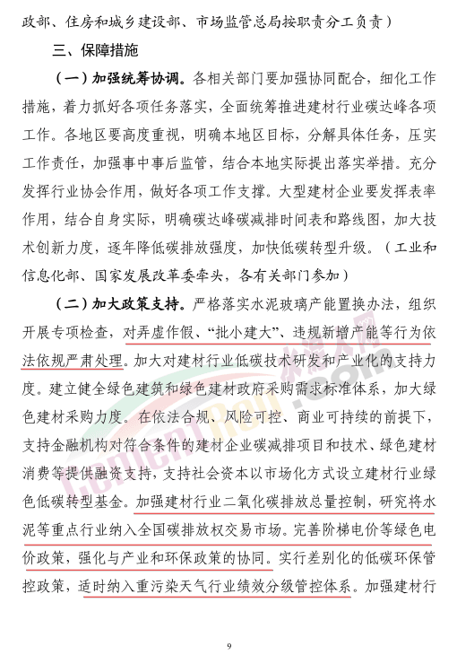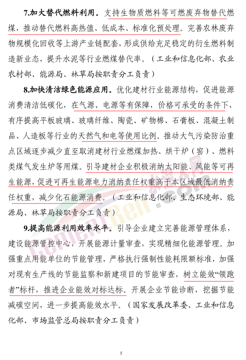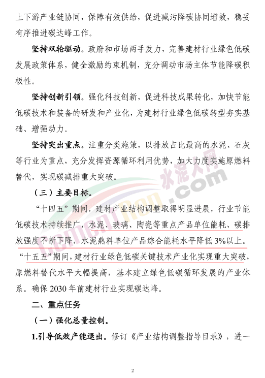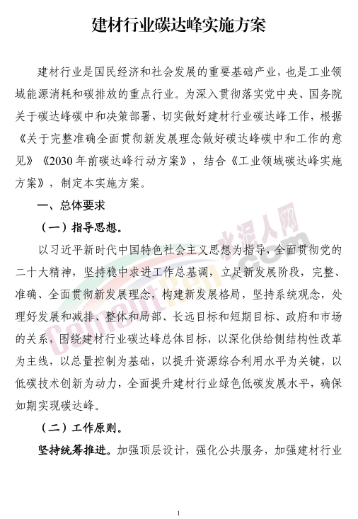 工業(yè)和信息化部、國家發(fā)展和改革委員會(huì)、生態(tài)環(huán)境部、住房和城鄉(xiāng)建設(shè)部等四部門聯(lián)合印發(fā)《建材行業(yè)碳達(dá)峰實(shí)施方案》,方案提出“十四五”期間,建材產(chǎn)業(yè)結(jié)構(gòu)調(diào)整取得明顯進(jìn)展,行業(yè)節(jié)能低碳技術(shù)持續(xù)推廣,水泥、玻璃、陶瓷等重點(diǎn)產(chǎn)品單位能耗、碳排放強(qiáng)度不斷下降,水泥熟料單位產(chǎn)品綜合能耗水平降低3%以上。“十五五”期間,建材行業(yè)綠色低碳關(guān)鍵技術(shù)產(chǎn)業(yè)化實(shí)現(xiàn)重大突破,原燃料替代水平大幅提高,基本建立綠色低碳循環(huán)發(fā)展的產(chǎn)業(yè)體系。確保2030年前建材行業(yè)實(shí)現(xiàn)碳達(dá)峰。