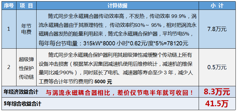 除上述性能優(yōu)勢外,江蘇磁谷同步永磁耦合器的應用還能大大節(jié)約水泥企業(yè)生產成本,以原使用渦流永磁耦合器對比估算,按1臺套平均功率315kW,每年工作8000小時進行測算,應用江蘇磁谷同步永磁耦合器后預計每年可節(jié)約8.3萬元,產生的經濟效益十分可觀。