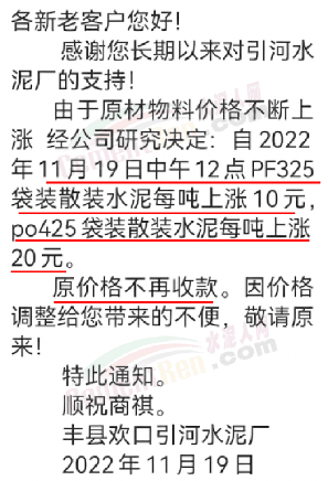 山東省菏澤市巨野東林水泥有限公司通知,受疫情管控及原材料價格上漲諸因素影響,導(dǎo)致生產(chǎn)成本大幅度增加,經(jīng)公司研究決定自2022年11月19日8時起42.5水泥在原來價格基礎(chǔ)上每噸上調(diào)20元,32.5水泥每噸上調(diào)10元,原價格不再收款。