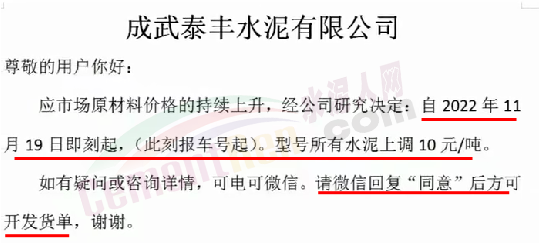 成武泰豐水泥有限公司通知,應(yīng)市場原材料價格的持續(xù)上升,經(jīng)公司研究決定自2022年11 月19日即刻起所有水泥上調(diào)10元/噸。微信回復(fù)“同意”后方可開發(fā)貨單。