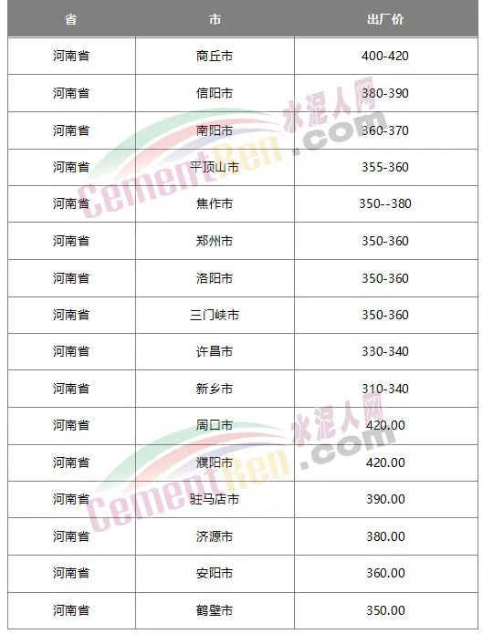 水泥人網(wǎng)信息中心重點(diǎn)監(jiān)控的河南省30多家企業(yè)報價顯示,截至11月21日,區(qū)域內(nèi)各企業(yè)出廠報價在310-420元/噸。