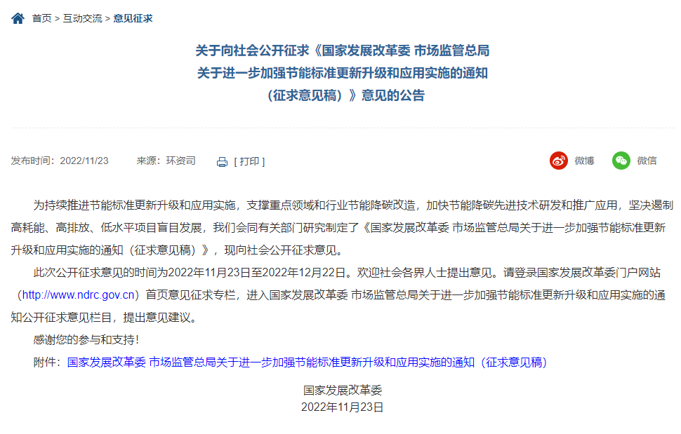 日前,國家發(fā)改委發(fā)布公告,對《國家發(fā)展改革委 市場監(jiān)管總局關(guān)于進(jìn)一步加強(qiáng)節(jié)能標(biāo)準(zhǔn)更新升級和應(yīng)用實(shí)施的通知(征求意見稿)》公開征求意見。