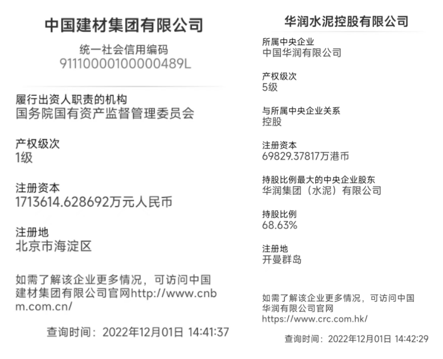 水泥人網(wǎng)通過查詢“中國建材集團有限公司,華潤水泥控股有限公司”了解到,中國建材集團有限公司為國務(wù)院國有資產(chǎn)監(jiān)管管理委員會下屬1級產(chǎn)權(quán)企業(yè)。華潤水泥控股有限公司為中央企業(yè)中國華潤有限公司控股企業(yè),產(chǎn)權(quán)級次為“5級”。
