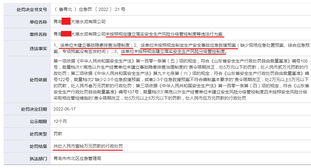 據(jù)青島市市北區(qū)應(yīng)急管理局的處罰決斷書(shū),對(duì)青島某水泥有限公司未按照規(guī)定建立生產(chǎn)風(fēng)險(xiǎn)分級(jí)管控制度等行業(yè)案作出罰款10萬(wàn)元的行政處罰。