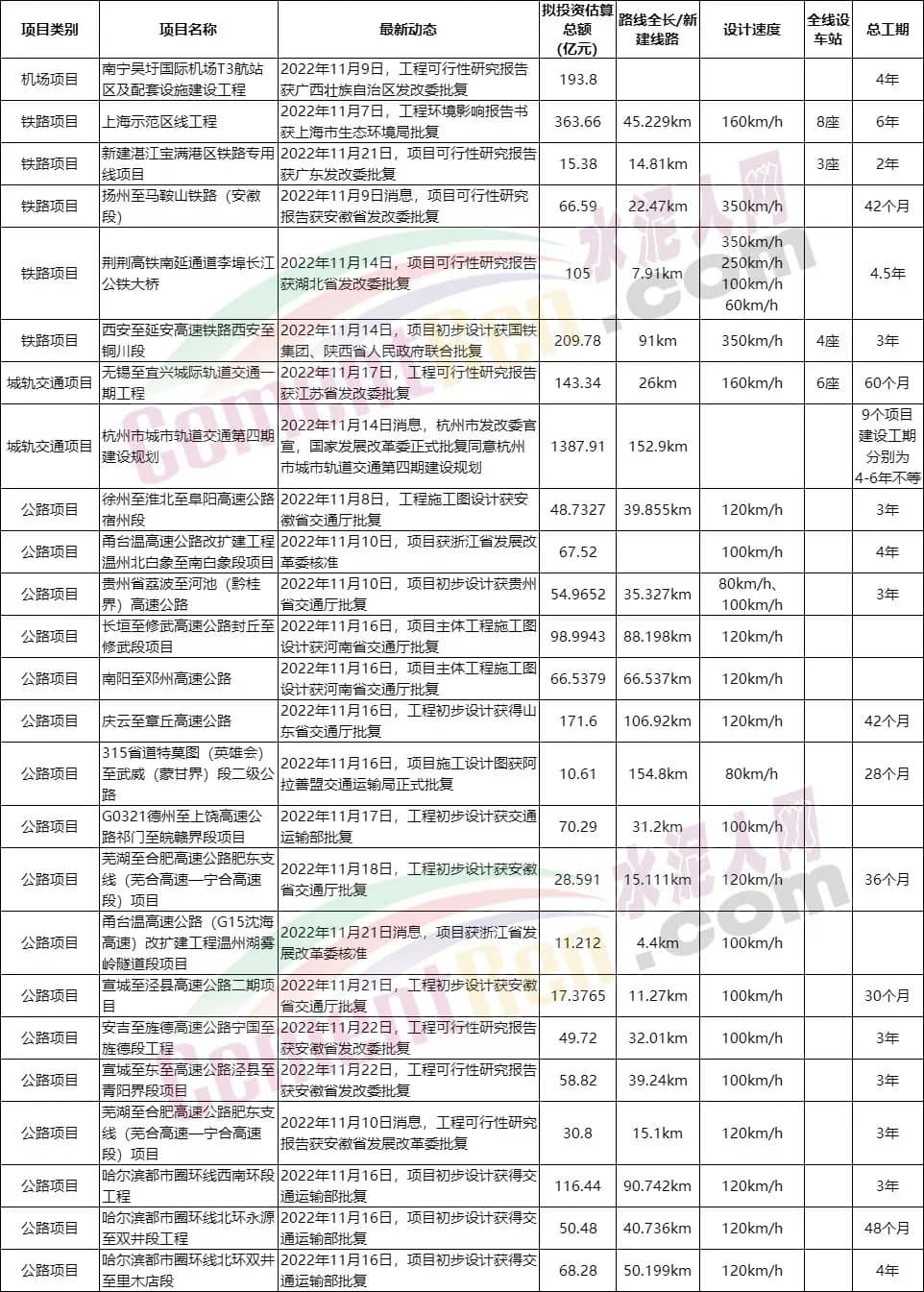 時(shí)至年末,涉及鐵路、公路、機(jī)場(chǎng)、城軌等重點(diǎn)項(xiàng)目獲批、開工。據(jù)水泥人網(wǎng)不完全統(tǒng)計(jì),僅11月份就有25項(xiàng)重大鐵路、公路、城軌交通及機(jī)場(chǎng)項(xiàng)目環(huán)評(píng)報(bào)告、可研報(bào)告、施工圖設(shè)計(jì)、項(xiàng)目核準(zhǔn)、初步設(shè)計(jì)獲得省/市發(fā)改委、生態(tài)環(huán)境局、交通廳等批復(fù),項(xiàng)目總投資額近3500多億元。