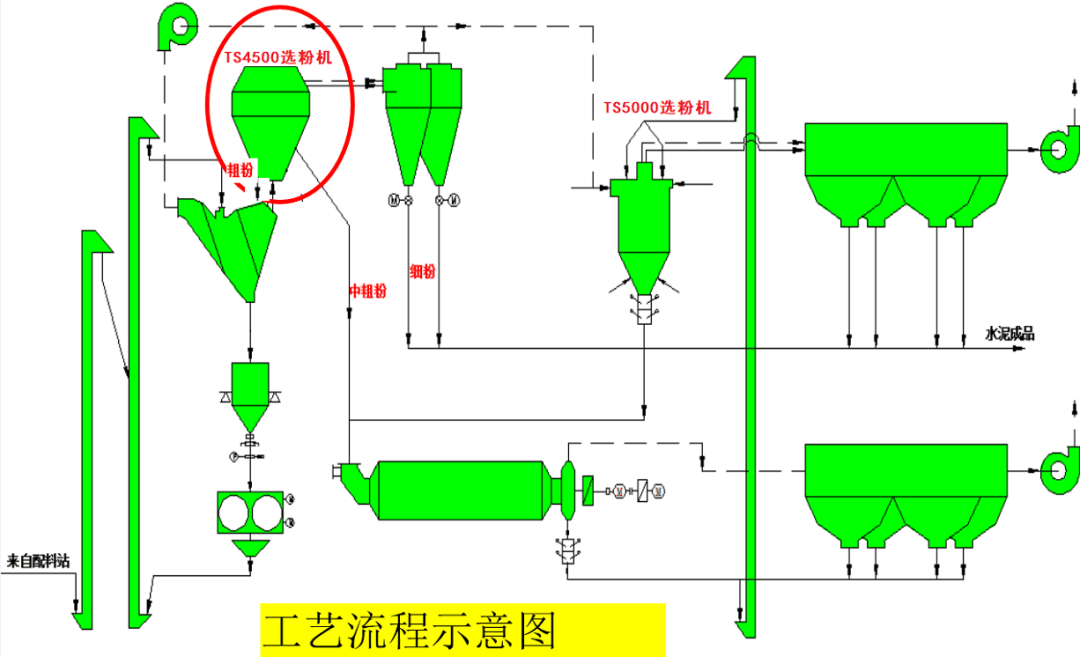 蘇州天山水泥生產(chǎn)工藝流程配置為4.2*13M管磨機(jī)+180*120輥壓機(jī)+TS4500雙轉(zhuǎn)籠選粉機(jī),首先將各原材料按照一定配比通過(guò)電子皮帶秤計(jì)量混合后送至配料提升機(jī),除鐵后進(jìn)入循環(huán)提升機(jī),提升至V型選粉機(jī)進(jìn)行選粉,粗顆?;睾阒貍}(cāng)緩沖后進(jìn)入輥壓機(jī)中碾壓,碾壓擠碎后通過(guò)循環(huán)提升機(jī)帶至V型選粉機(jī),V型選粉機(jī)粗選出的較細(xì)物料進(jìn)入TS4500選粉下轉(zhuǎn)籠初選,200um以上的顆粒通過(guò)下轉(zhuǎn)籠選粉后回恒重倉(cāng),小于200um的顆粒進(jìn)入TS4500選粉機(jī)上轉(zhuǎn)籠再次進(jìn)行選粉,合格品通過(guò)旋風(fēng)筒收集送入成品斜槽與磨機(jī)成品進(jìn)行混合,不合格品進(jìn)入球磨機(jī)進(jìn)行粉磨,球磨機(jī)粉磨后的物料通過(guò)出磨提升機(jī)提升至TS5000選粉機(jī)選粉,合格品通過(guò)系統(tǒng)風(fēng)機(jī)帶入收塵系統(tǒng)收集后進(jìn)入成品斜槽與TS4500成品混合,最終送入水泥庫(kù)作為水泥成品儲(chǔ)存,不合格品回球磨機(jī)進(jìn)行再次粉磨。