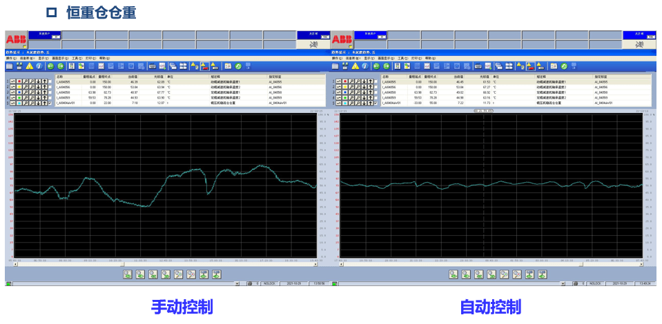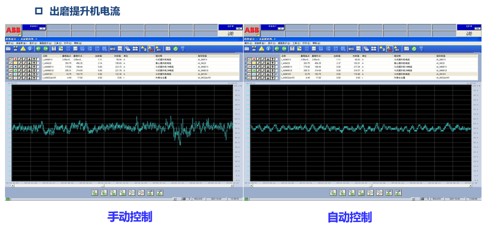 1、智能控制系統(tǒng)投運(yùn)至今,實(shí)現(xiàn)自控率大于95%,輥壓機(jī)循環(huán)系統(tǒng)和磨機(jī)系統(tǒng)始終保持平衡穩(wěn)定狀態(tài),各參數(shù)波動(dòng)幅度大幅度降低,水泥生產(chǎn)全智能、準(zhǔn)無(wú)人化運(yùn)行,可靠實(shí)現(xiàn)了生產(chǎn)過(guò)程的連續(xù)、平穩(wěn)運(yùn)行,下圖為恒重倉(cāng)倉(cāng)位和出磨提升機(jī)電流手動(dòng)控制和自動(dòng)控制趨勢(shì)對(duì)比圖。