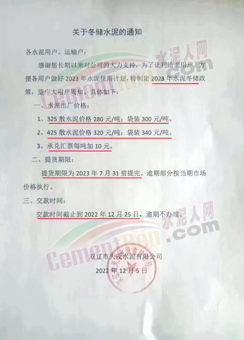 日前,吉林省雙遼市天茂水泥發(fā)布《關于冬儲水泥的通知》稱,為感謝老客戶對公司的大力支持,讓利給老用戶,方便各用戶做好2023年水泥使用計劃,特制定2023年水泥冬儲政策。