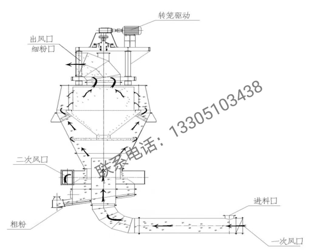 該選粉機(jī)突破了原有超細(xì)分級(jí)機(jī)生產(chǎn)能力小、選粉效率低,比表面積難于提高、微細(xì)粉宜團(tuán)聚難于分散等多項(xiàng)技術(shù)瓶頸,解決了超細(xì)分級(jí)設(shè)備無(wú)法實(shí)現(xiàn)大規(guī)模分選超細(xì)微粉的關(guān)鍵技術(shù)難題。該選粉機(jī)分級(jí)精度準(zhǔn),選粉效率高,選粉效率平均值達(dá)到80.6%。在高選粉效率的情況下,保證適中的循環(huán)負(fù)荷(120%),以保證物料在超細(xì)球磨機(jī)內(nèi)能夠得到充分的研磨,可根據(jù)用戶需要生產(chǎn)比表在700~1000m2/kg的超細(xì)微粉。