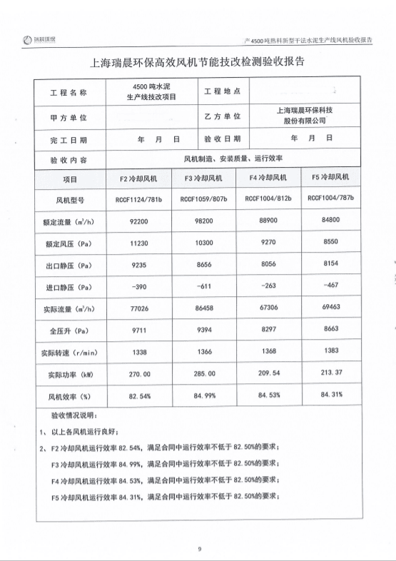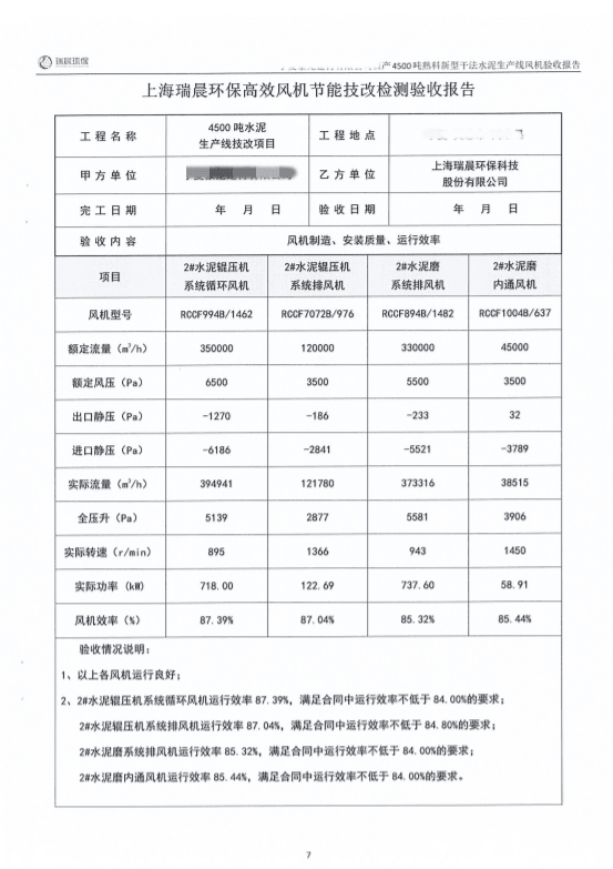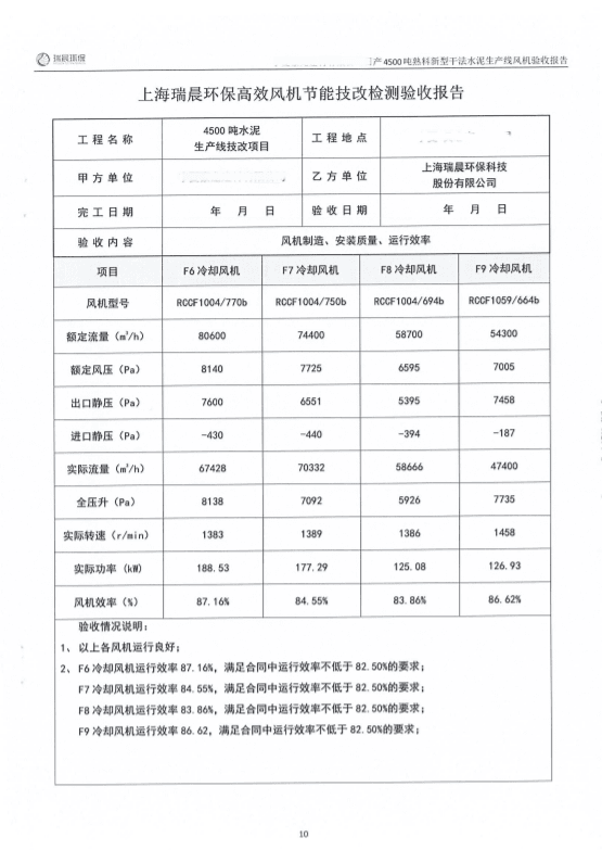 2022年8月,該水泥企業(yè)組織雙方共同對全線風(fēng)機進行了聯(lián)合驗收測試。測試結(jié)果顯示,風(fēng)機運行良好,實測效率優(yōu)于合同約定效率,達到雙方約定的驗收指標(biāo),風(fēng)機單耗低,使用效果好。