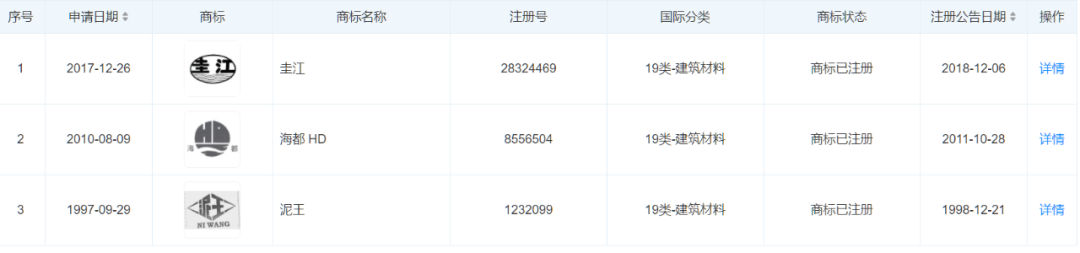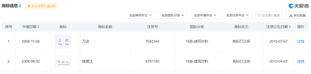 企業(yè)商標(biāo)注冊(cè)信息顯示,旗下共有“萬凌”和“鴛鴦江”兩個(gè)注冊(cè)品牌,并沒有不合格品所列的“粵華水泥”注冊(cè)商標(biāo)。