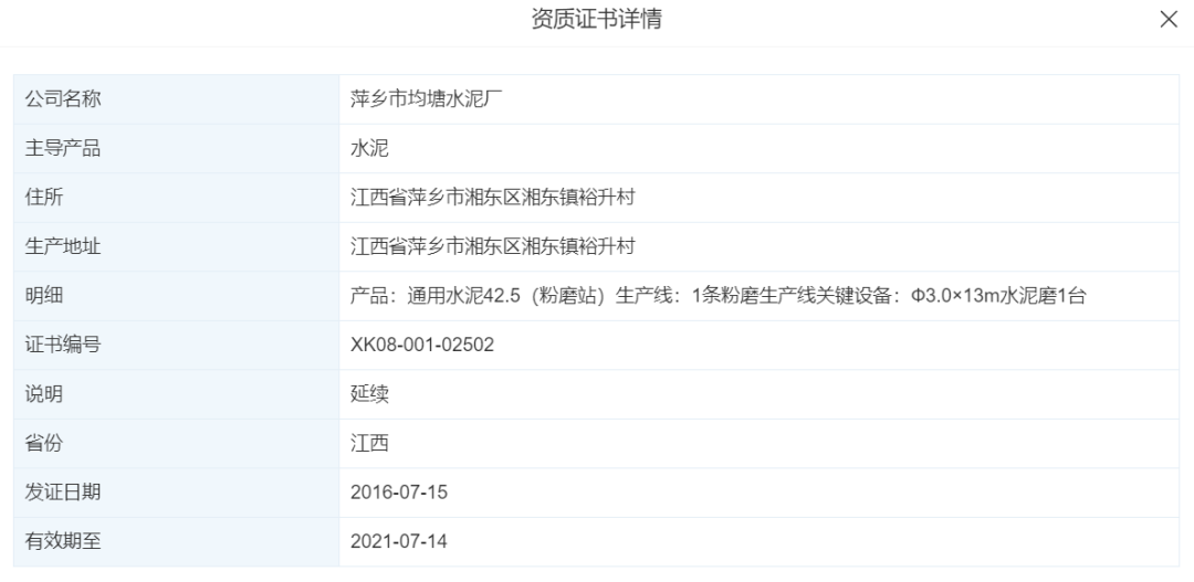 據(jù)查詢,萍鄉(xiāng)市均塘水泥廠生產(chǎn)類型為粉磨站,生產(chǎn)許可證編號(hào)為XK08-001-02502。該編號(hào)生產(chǎn)許可證有效期截止到2021年7月14日,目前已處于無效狀態(tài)。且“普樂夫”品牌亦非該企業(yè)自有。