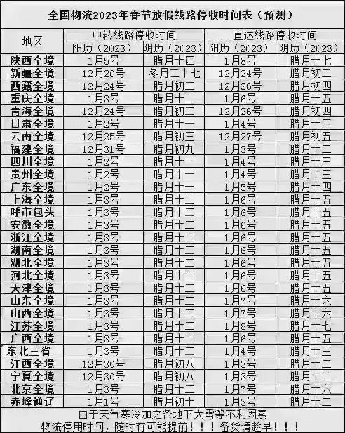 據(jù)網(wǎng)傳全國(guó)物流2023年春節(jié)放假停收時(shí)間表預(yù)測(cè),中轉(zhuǎn)線路停收時(shí)間最早從12月20日開(kāi)始,直達(dá)線路停收時(shí)間最早從12月24日開(kāi)始。